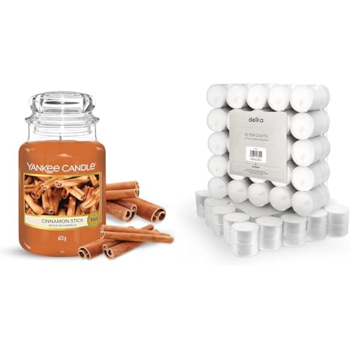 Yankee Candle Scented Candle | Cinnamon Stick Large Jar Candle | Long Burning Candles: up to 150 Hours & delka 8 Hour Tea Light Candles, 50 Pack, Long Burning Time, Unscented Tea Lights - White