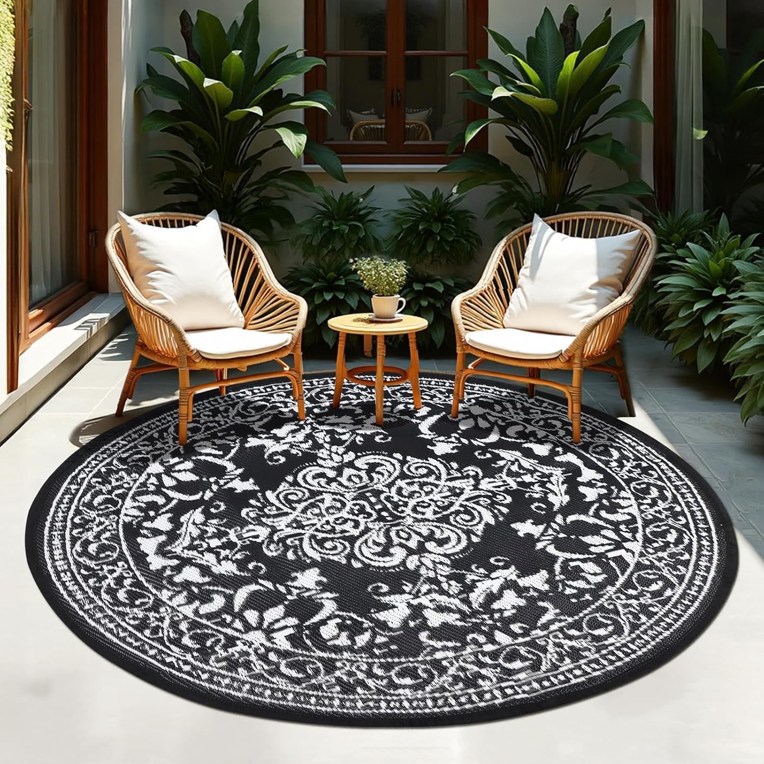 TUKDAK Black Outdoor Rug Round 180cm, Vintage Circle Garden Rugs Outdoor Waterp