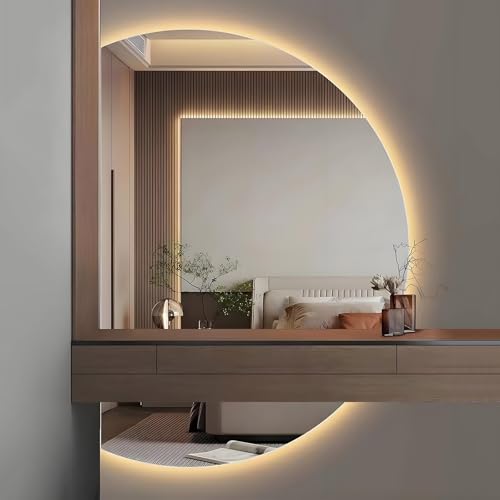 Dijateman 3 Colors Half Circle Fogless Backlit Wall Mirror with Lighted, Frameless Shatter-Proof Dressing Mirror, Dimmable, for Vanity Entryways Home Decor(Cut right,90cm)