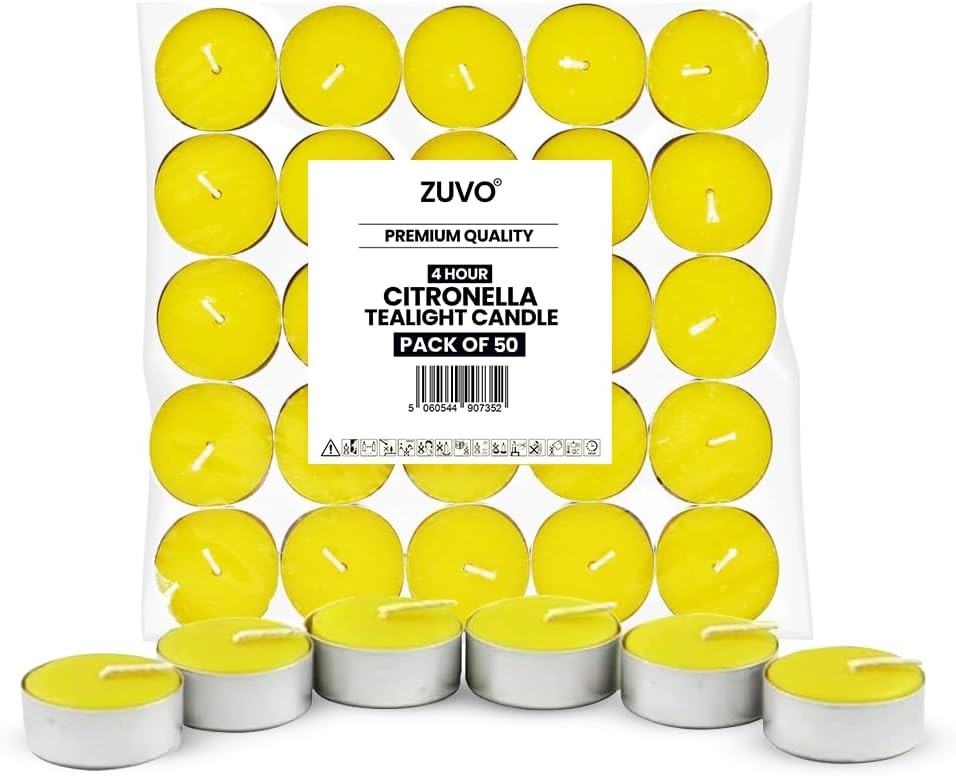 Zuvo Citronella Tealight Candles (50 Pack) – 4-Hour Burn, Anti-Mosquito Outdo
