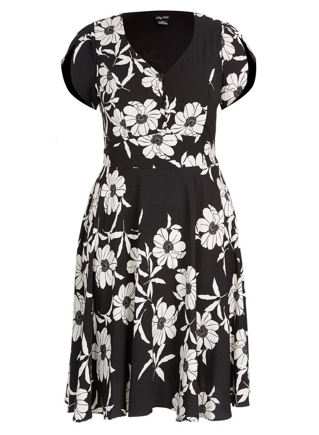City Chic Floral Float Print Fit & Flare Dress Black/White UK 22 XL LN100 EE 05