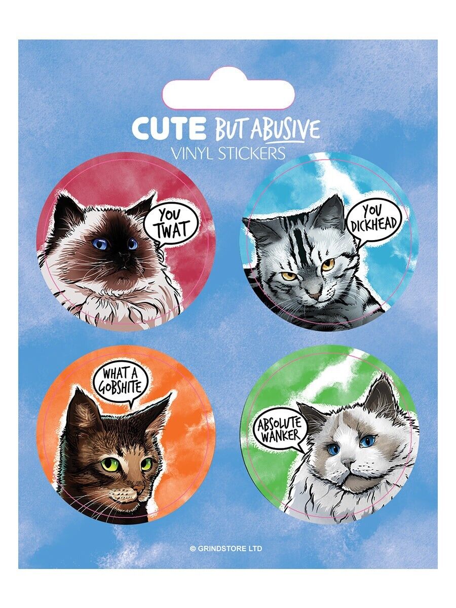CUTE BUT ABUSIVE CATS 4 Sticker Set: sweary you f*ck idiot arse kitten fun gift