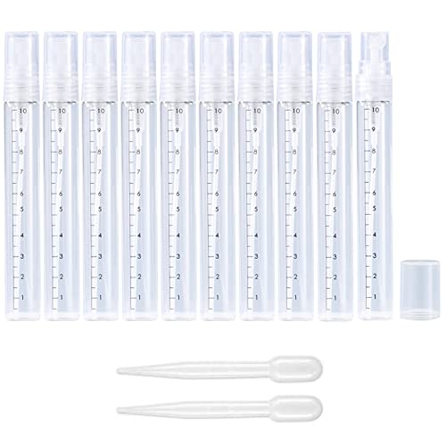 Apstaqeoo 10Pcs, 10Ml Empty Glass Spray Bottles with Scale - Clear Mini Sample Perfume Atomizer Vial Travel Bottles Set with Fine Mist Sprayer & Clear Dust Cap Perfect for Fragrance, Essential Oils