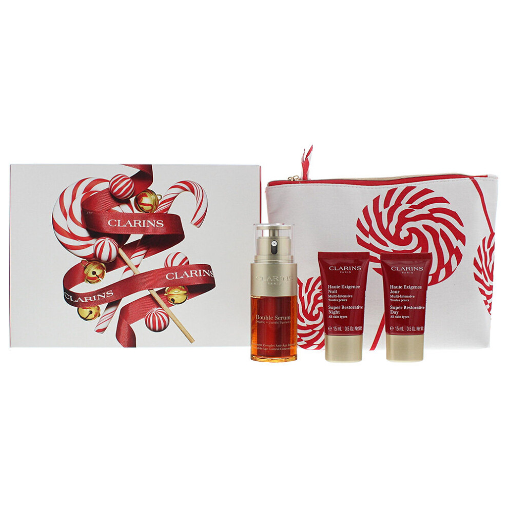 Clarins Double Serum 4 Piece Gift Set: Double Serum 30ml - Super Restorative Day Cream 15ml - Super Restorative Night Cream 15ml - Pouch