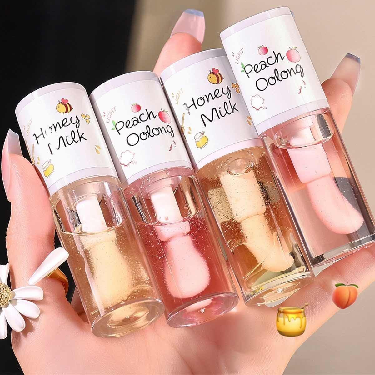 (White Peach Oolong) Peach Milk Honey Lip Oil Relieves Dry Moisturizing Lip Gloss Fades Lip Lines Water Light Lips Big Brush Head