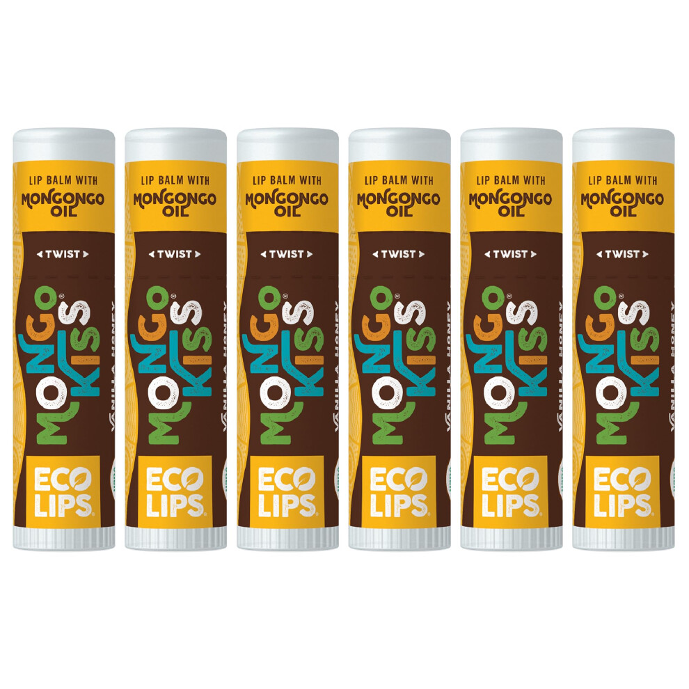 LIP BALM Mongo Kiss 6-Pack (6 tubes) Vanilla Honey by Eco Lips 100% Organic Beeswax & Cocoa Butter Lip Care with Organic Mongongo Oil - Soothe & Moist