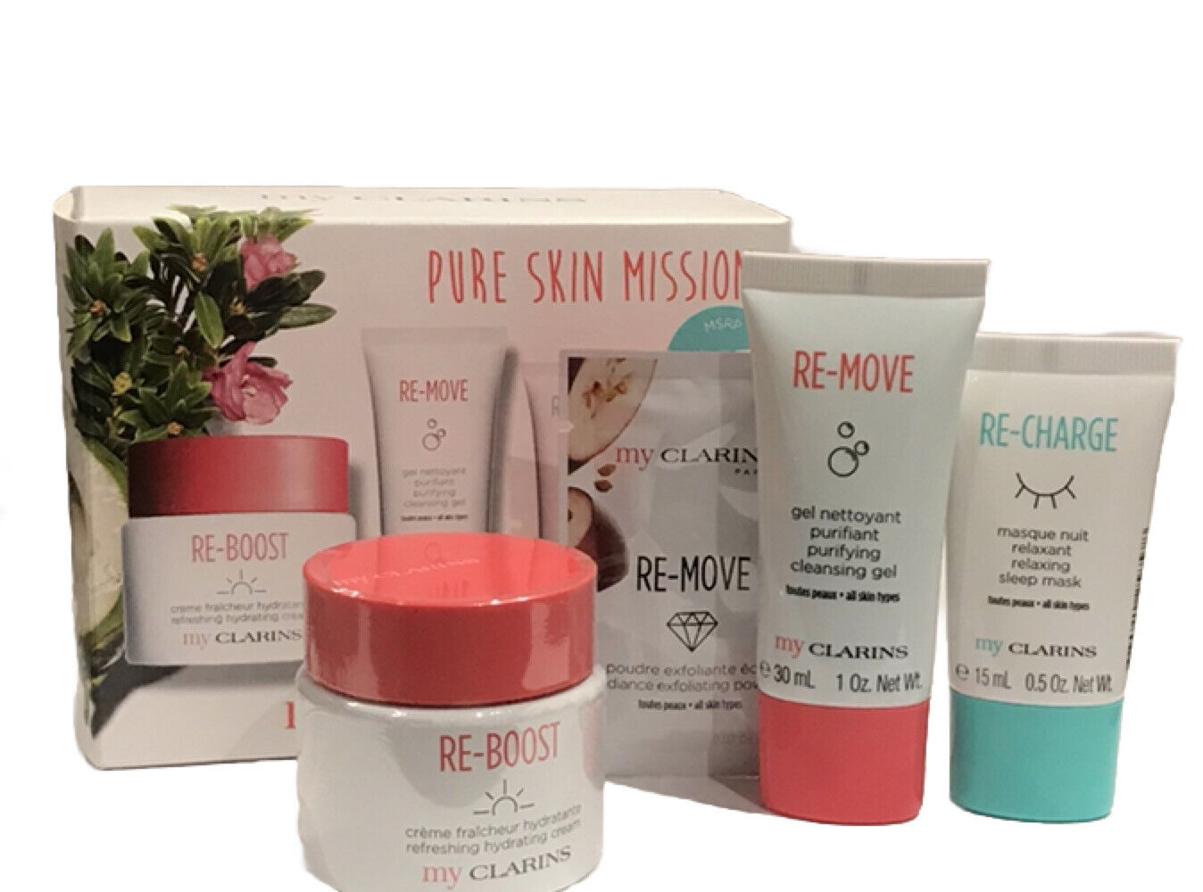 Clarins Pure Skin Mission Kit Re-boost Cream Re-move Cleanser Re-charge Mask