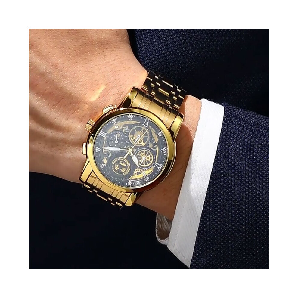 Men Watch Stainless Steel Classy Business Watches Male Auto Date Clock Fashion Quartz Wrist Watch Relogio Masculino (Gold White)