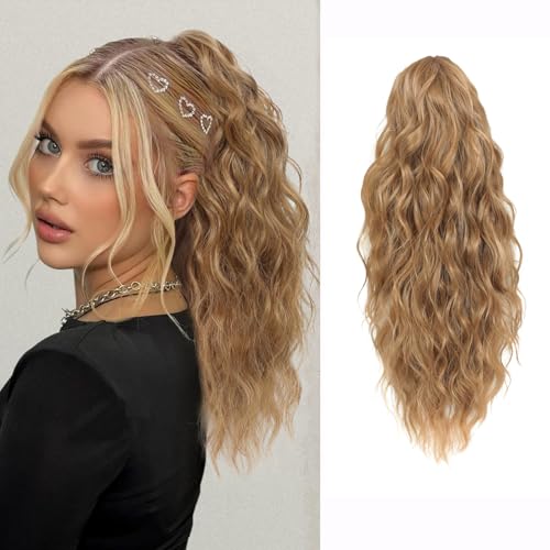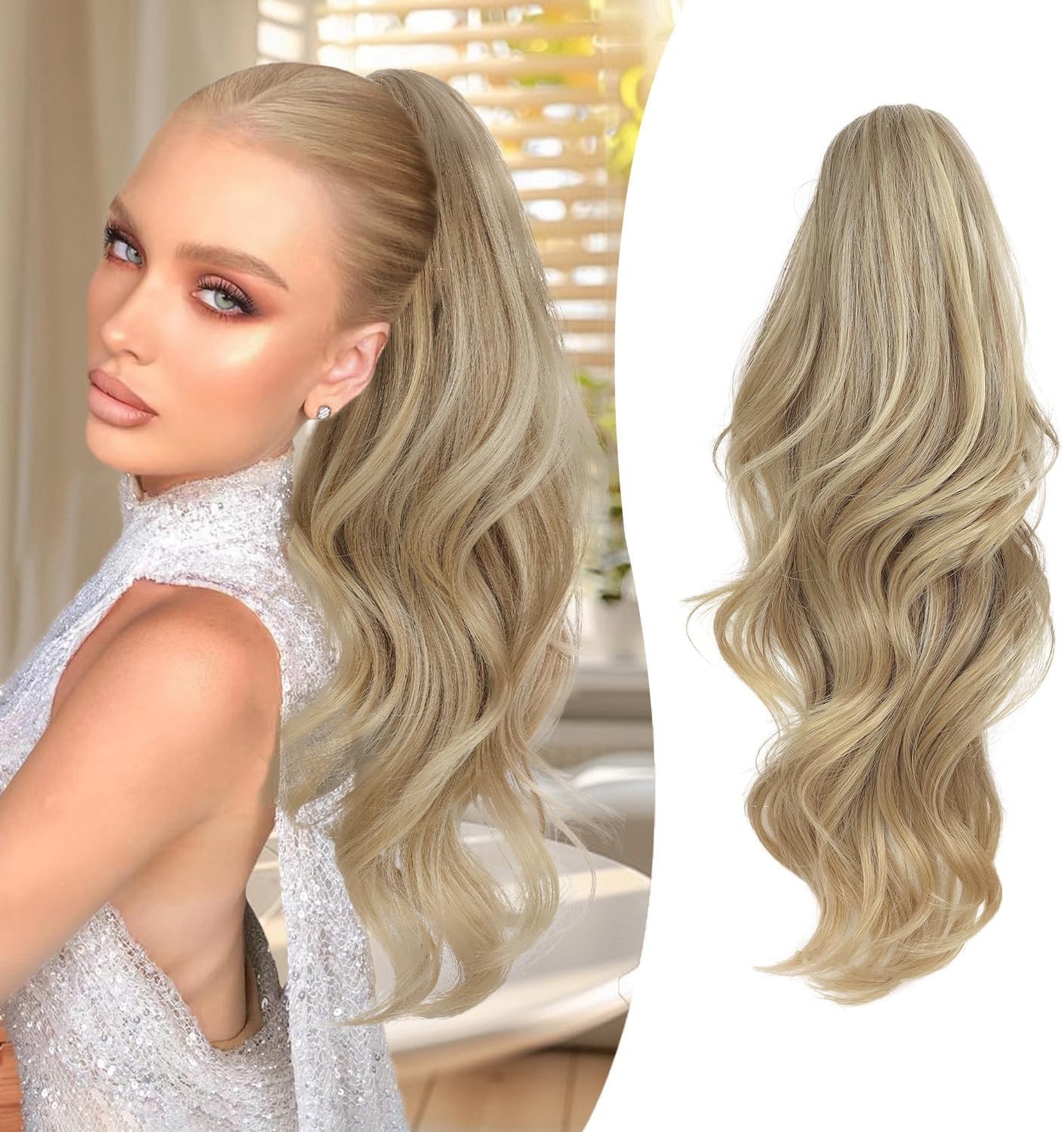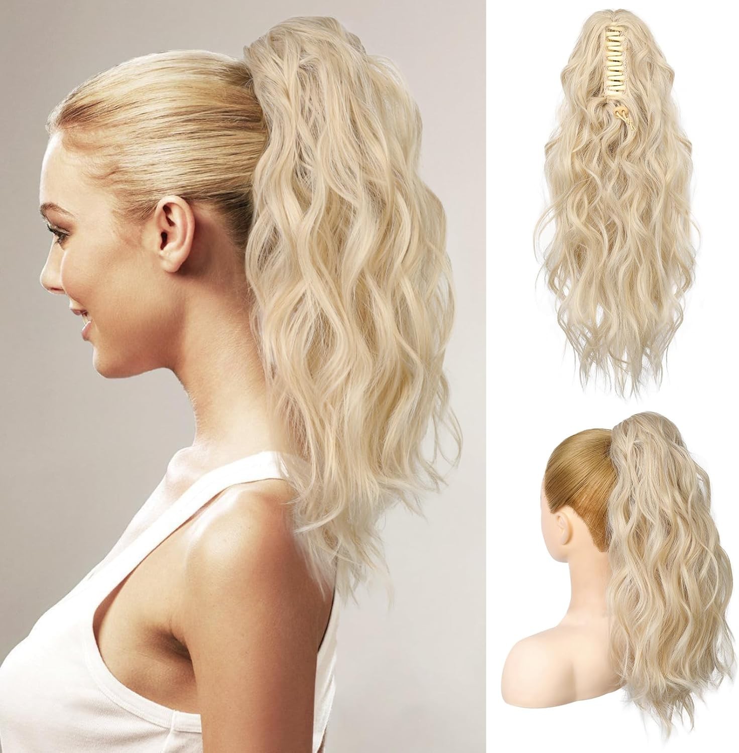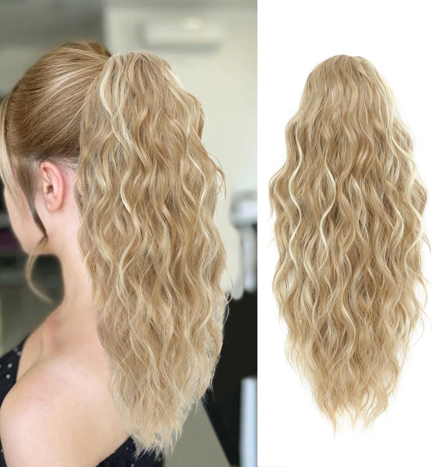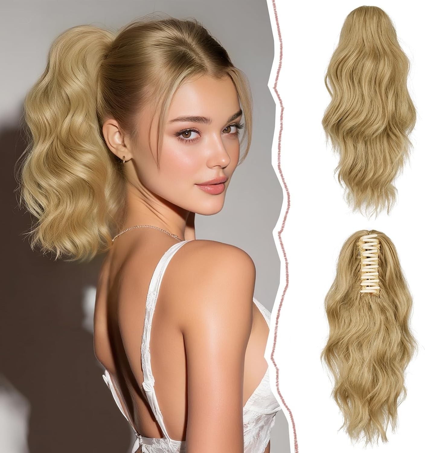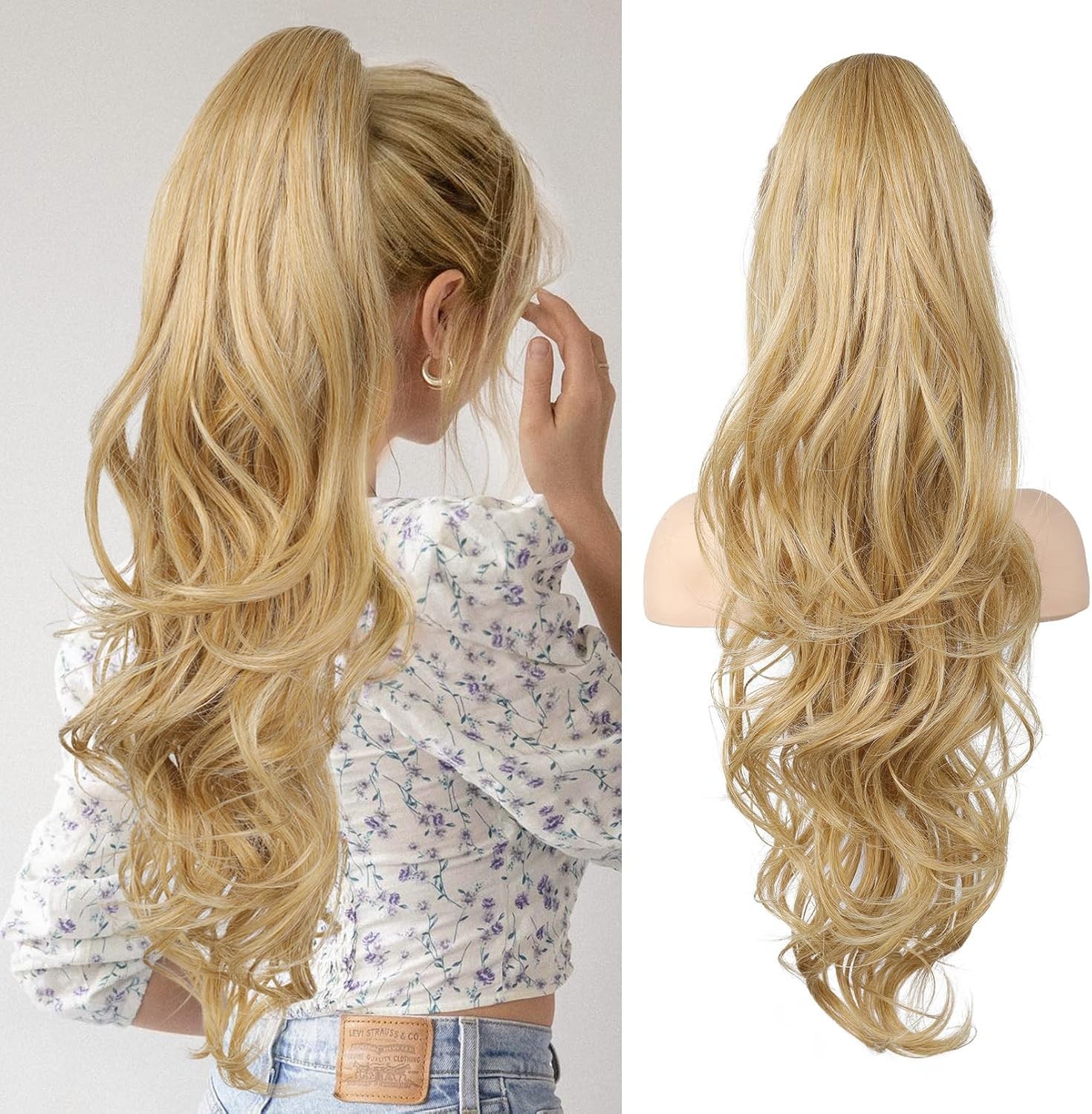 Fine Plus Highlights Ponytail Extension 18inch Claw Clip in Ponytail Hair Extensions for Women Curly Wave Claw Ponytail Extension Synthetic Clip in Hairpiece - Golden Blonde