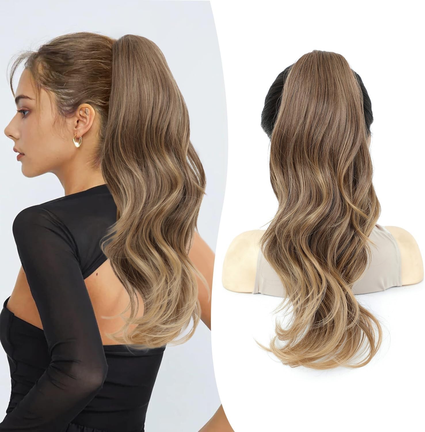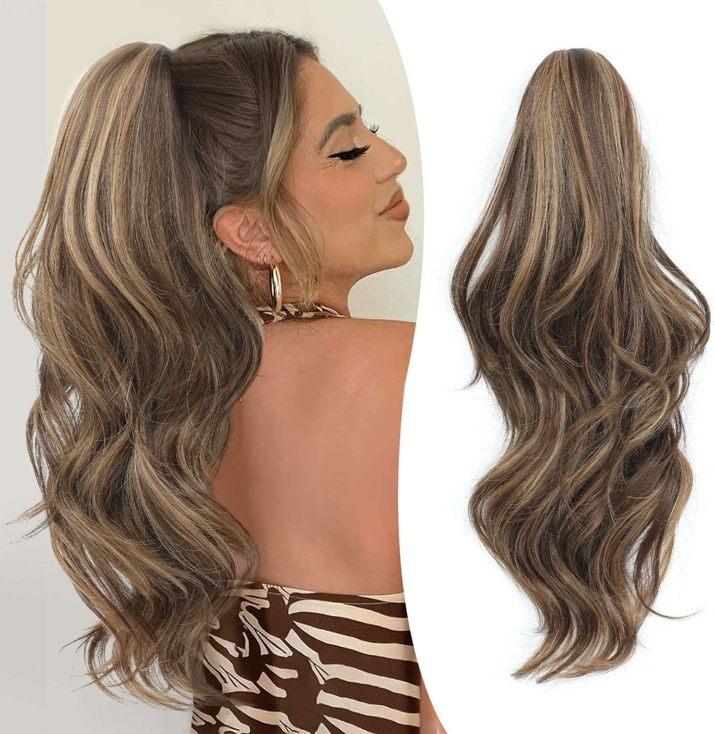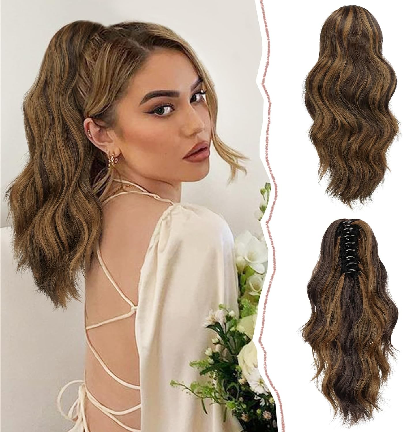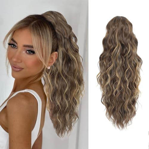 FINE PLUS Ponytail Extension, Claw Clip in Ponytail Hair Extensions Synthetic 18inch Curly Wave Hair Pieces for Women Light Brown with Highlights