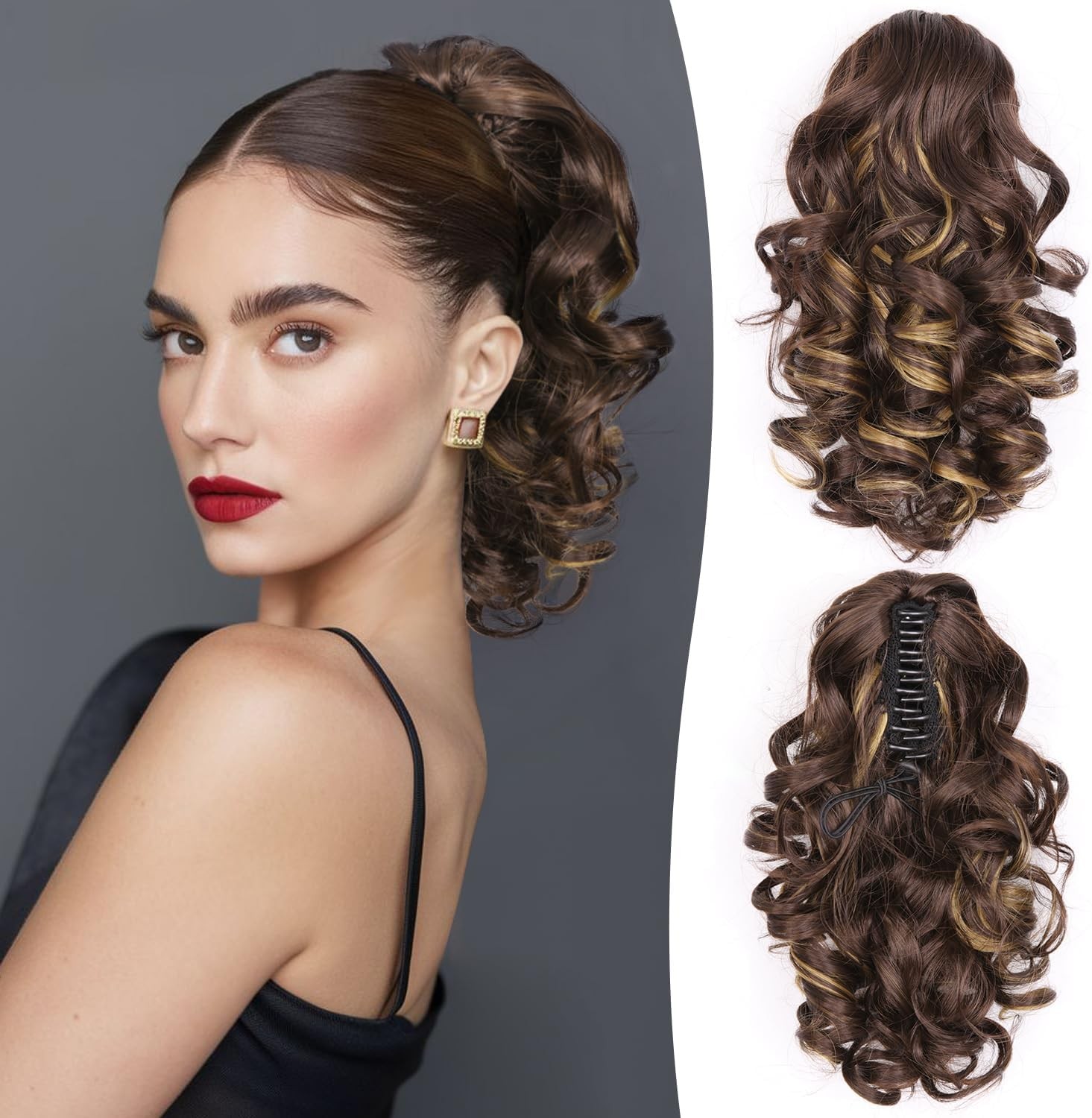 BUYOGET Claw Clip Bun Ponytail Extension Short Curly Wavy Claw Jaw Clip in Synthetic Hairpiece Pony Tail Tale 2 Inches Brown
