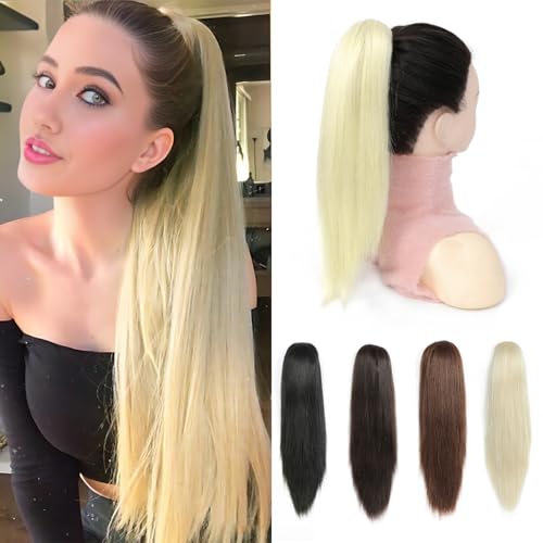 Yamel Ponytail Extension Claw Clip Ponytail 16 Inch Bleach Blonde Straight Synthetic Ponytail Hairpiece for Women