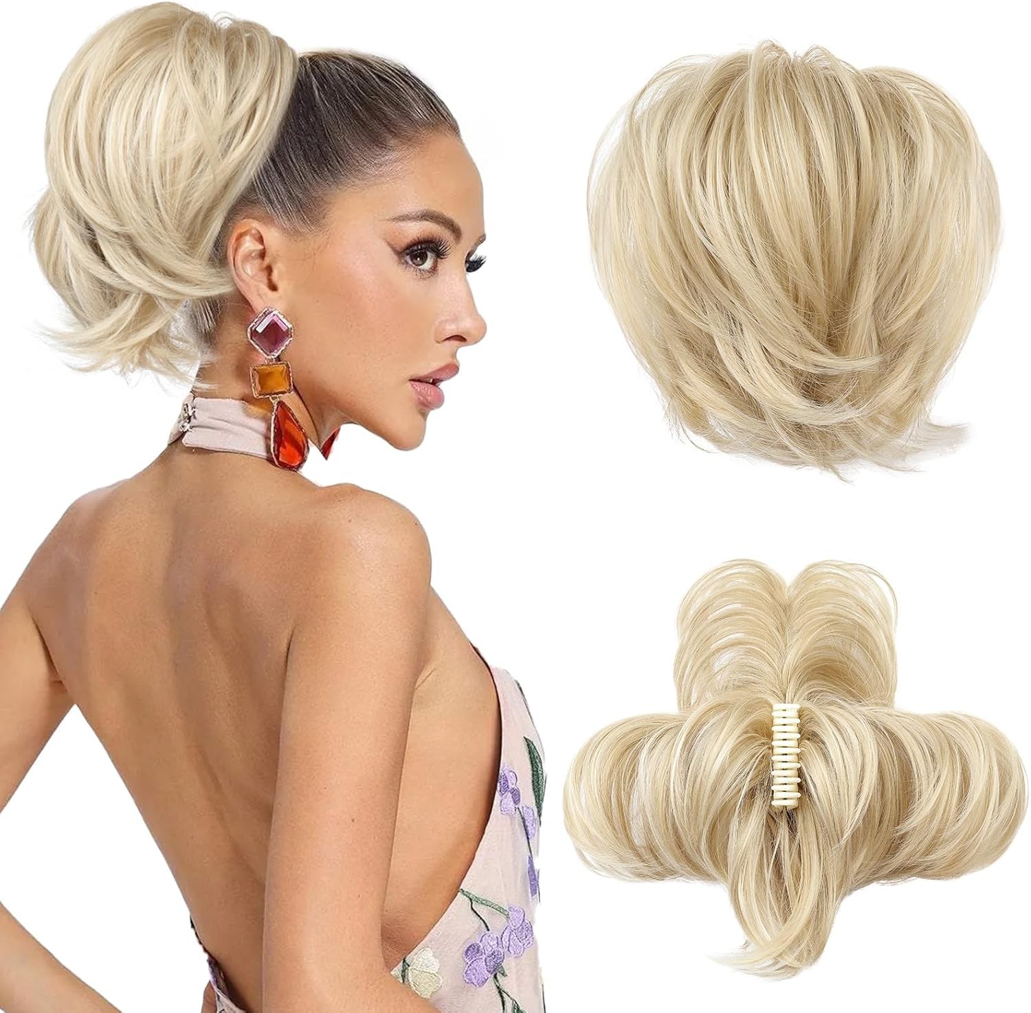 Messy Bun Hair Piece for Women, Curly Wavy Hair Bun Extensions, Synthetic Tousled Updo Clip On Hairpieces, Messy Bun with Claw Clip for Ponytail or Fake Hair Bun for Women Girls (Gold)