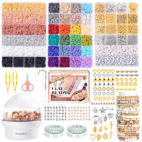 Beadact 7200 PCS Clay Beads Bracelet Making Kit with Bead Spinner, 3 Boxes Earth-Toned Colors Clay Bead and Letter Beads, Friendship Bracelet Making Kit, Charm Crafts Kits Gifts