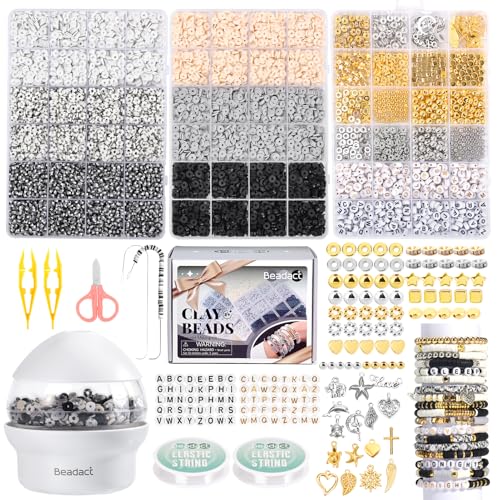 Beadact Clay Beads 7200 Pcs 30 Colors Bracelet Making Kit with Bead Spinner, 3 Boxes Black White Clay Bead and Letter Beads, Friendship Bracelet Jewelry Making Kit Gift for Adults Beading Lovers