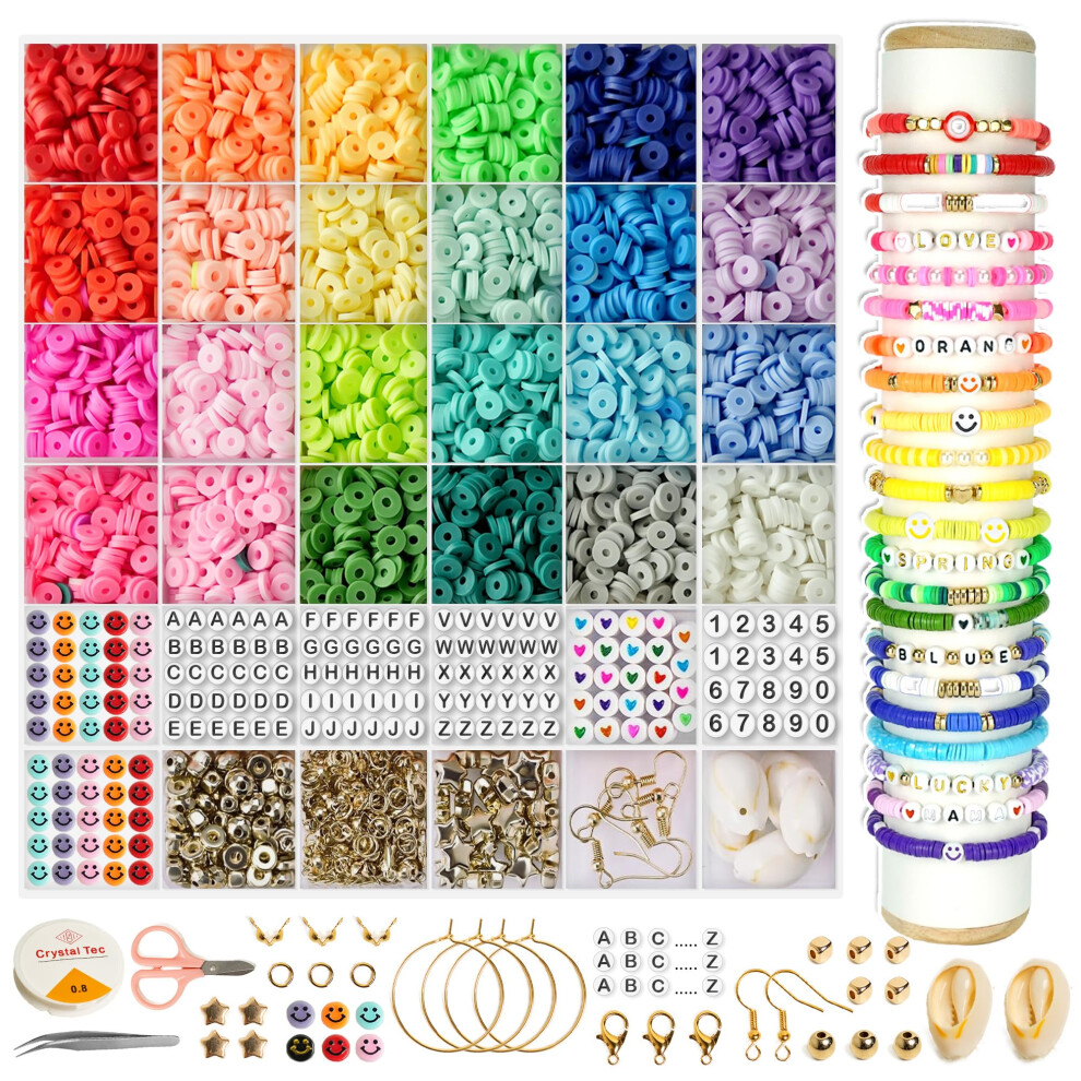 ProPinz 7000pcs Clay Beads Bracelet Making kit, 28 Colors Round Polymer Heishi Clay Bead Set with Charms and Essential Accessories, for Bracelet Necklace Earring DIY with Letter Beads for Kids