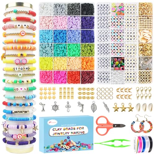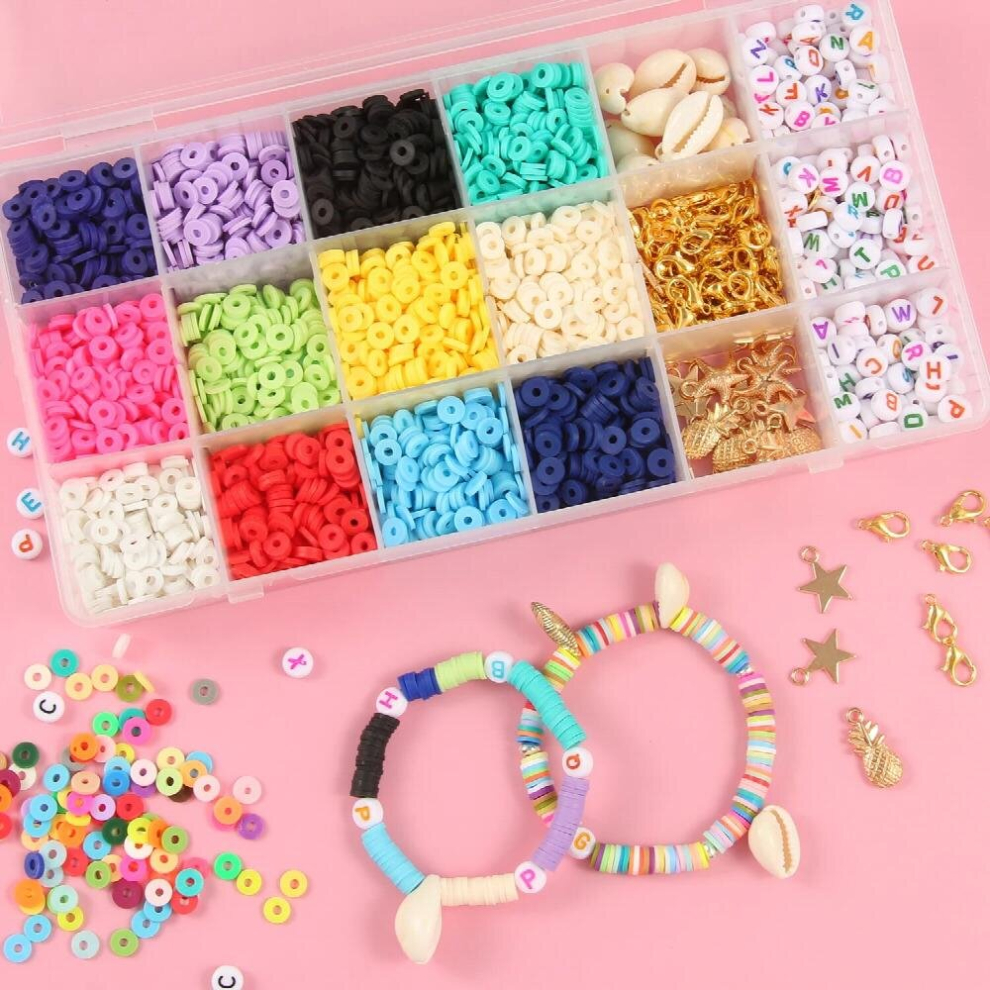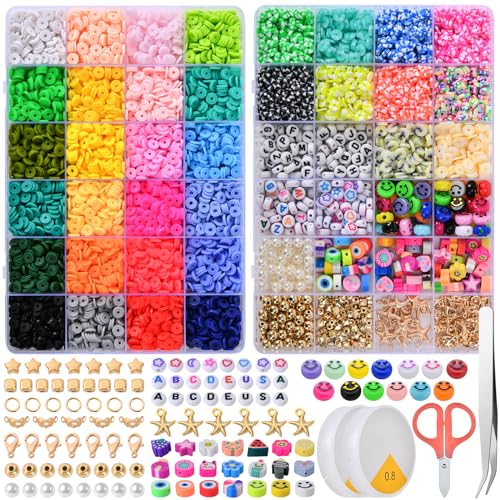 ProPinz 7000pcs Clay Beads Bracelet Making kit, 28 Colors Round Polymer Heishi Clay Bead Set with Charms and Essential Accessories, for Bracelet Necklace Earring DIY with Letter Beads for Kids