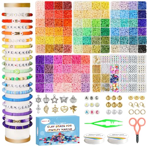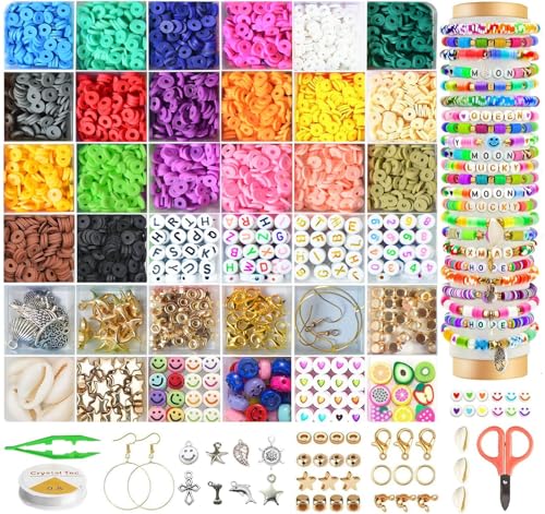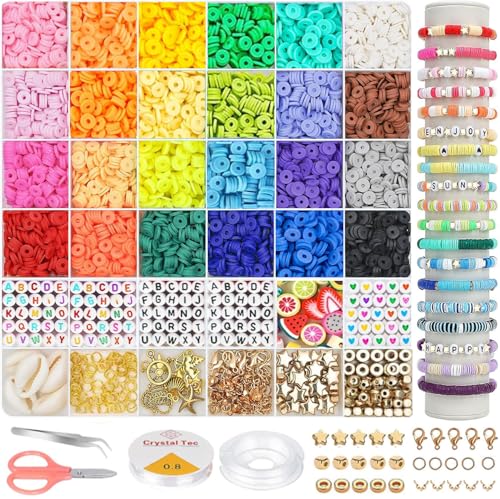 WHEELIO 8500 PCS Clay Beads Bracelet Making Kit, 34 Colors Flat Round Polymer 6mm with Letter Beads