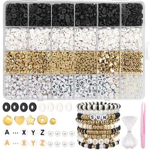 Aileem 3164pcs Clay Beads Bracelet Making Kit, White Black Flat Round Polymer Clay Bead Spacer for Jewelry Making with Letter Beads, Hearts, Flowers, pentagrams etc for DIY Crafts Earrings Bracelets