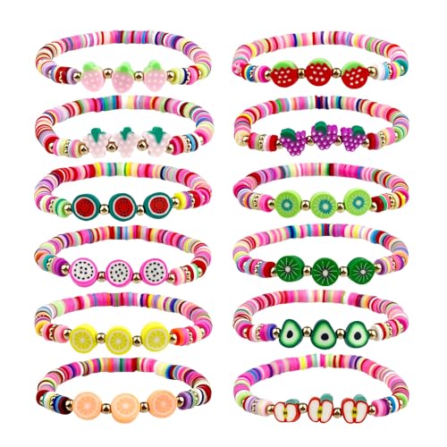 Bestanhoye 12 PCS Friendship Bracelets Party Bag Fillers for Girls Kids, Novelty Colorful Bracelets BFF Clay Beads Set Jewelry Gifts with Cute Charm Beads