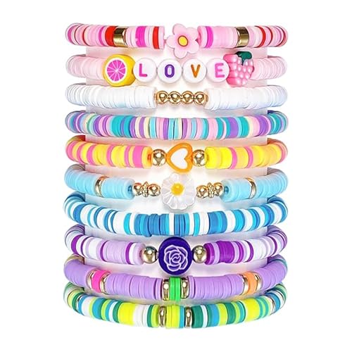 BENIFILE Friendship Bracelets, 12 Preppy Colorful Bracelets for Girls, BFF Adjustable Heart Clay Beads Set for Summer Surfer Beach Party Accessories