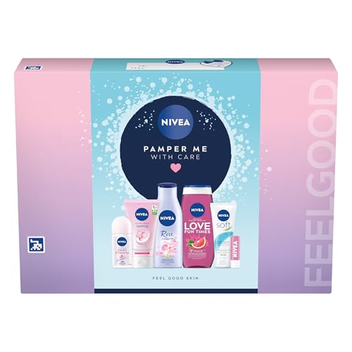NIVEA Pamper Me With Care Gift Set (6 Products), Women's Gift Set with Shower Gel, Moisturising Cream, Body Lotion, Lip Balm, Anti-Perspirant Roll-On, and Cream Wash