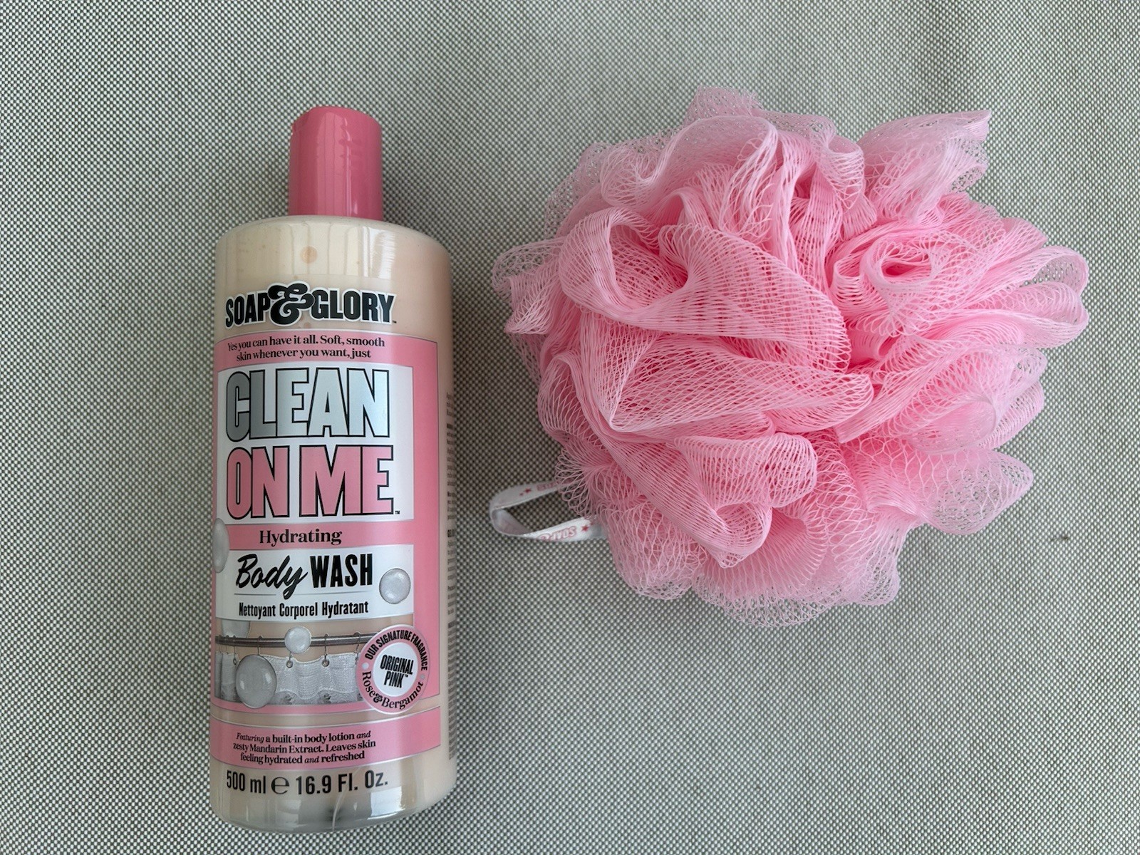 Soap & Glory CLEAN ON ME Hydrating Body Wash Original Pink 500ml & Body Puff