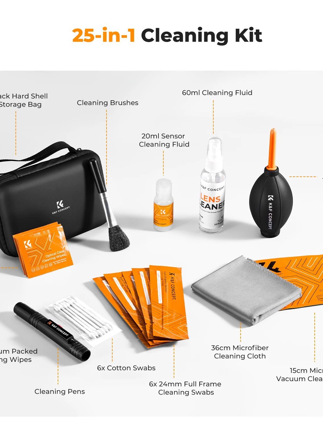 K&F CONCEPT 25 in 1 Camera Cleaning Kit with Camera Blower Wipes Cloth Swabs Cleaner Liquid Cleaning Pen for Camera Lens Phone