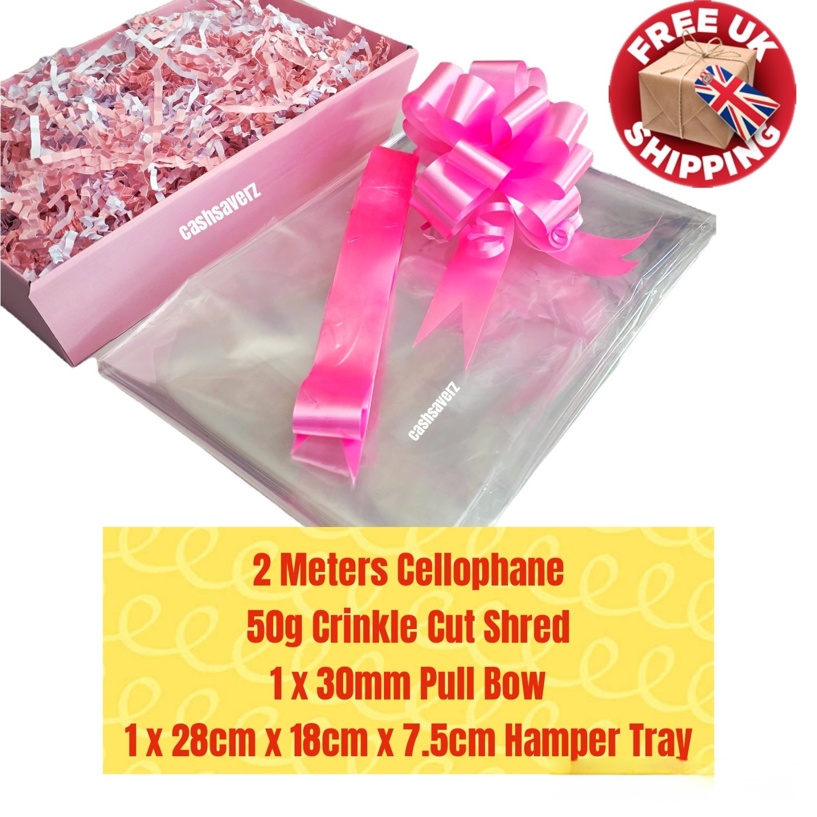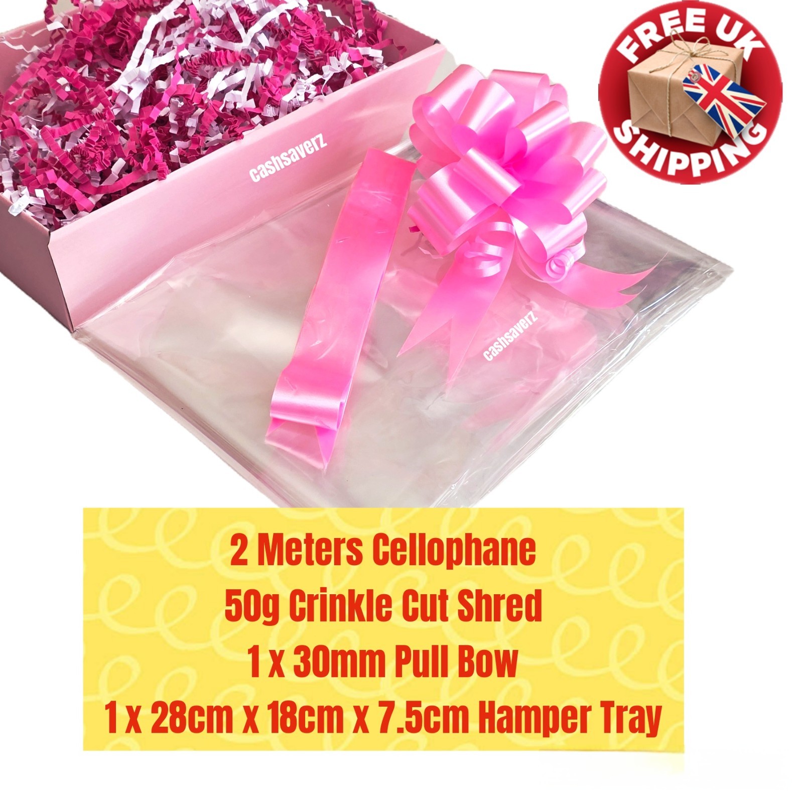 Pink DIY Hamper Kit Clear Cellophane 50g Shred + Bow Birthday Baby Shower Girl