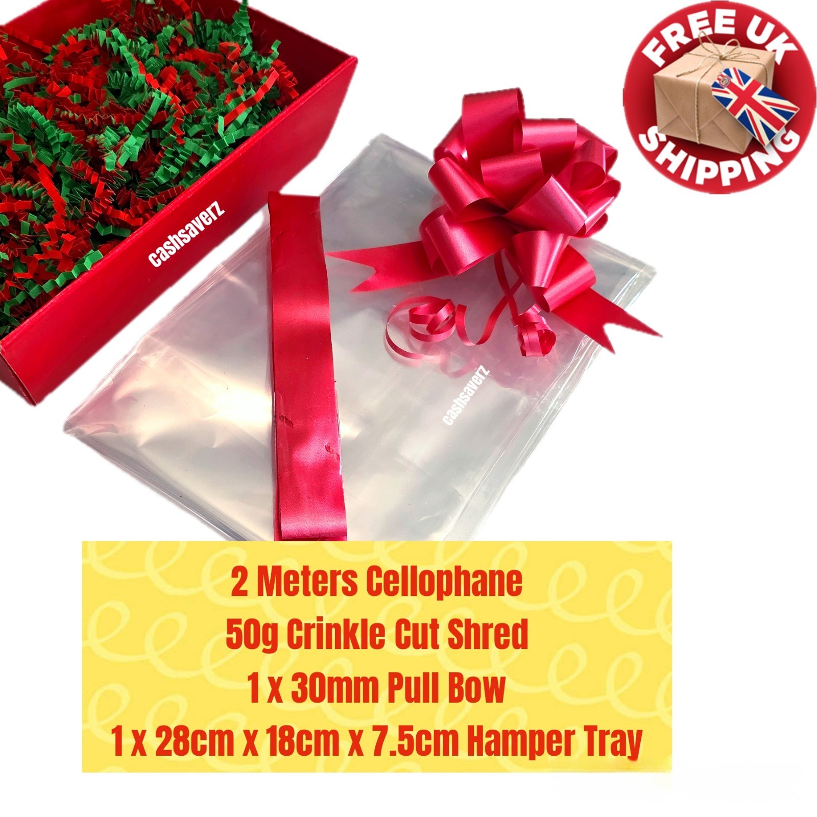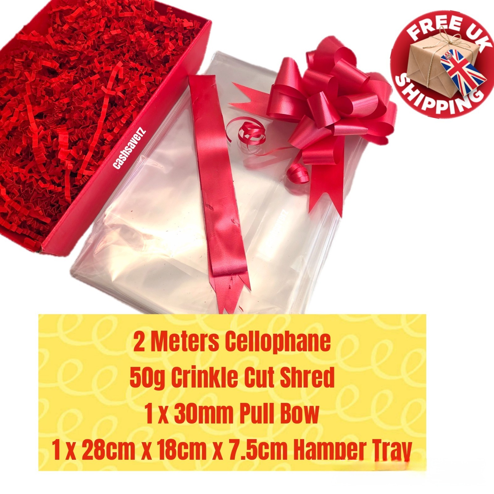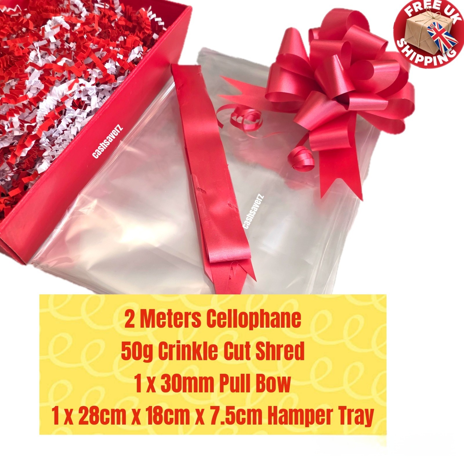 Red DIY Hamper Kit 2M Clear Cellophane Wrap 50g Shred + Bow Valentines Birthday