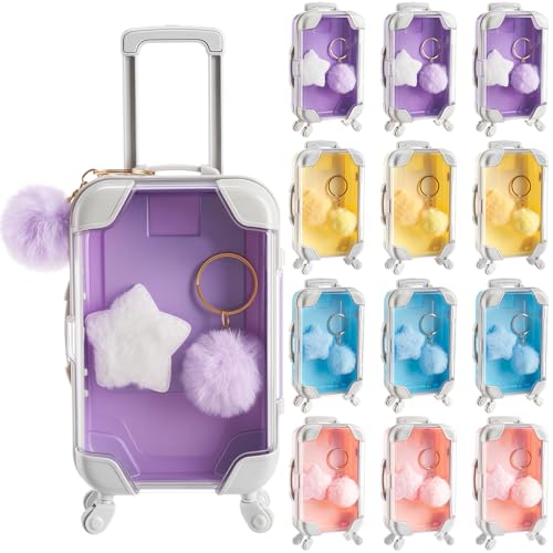 Fyozyon 36 Pcs Mini Suitcase Party Favor Box with Plush Ball Keychains and Hair Clips 6.69 x 3.74 x 1.97 Inches Clear Mini Suitcase Gift Box for Travel Baby Shower Wedding Holiday (Multicolor)
