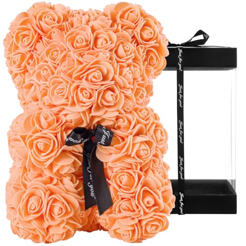 DuHouse Rose Bear Rose Teddy Bear Flower Gift Black Box for Valentines Gifts Anniversary Christmas,Birthdays Bridal Showers -Fully Handmade 10 inch Flower Bear Clear Gift Box (Orange)