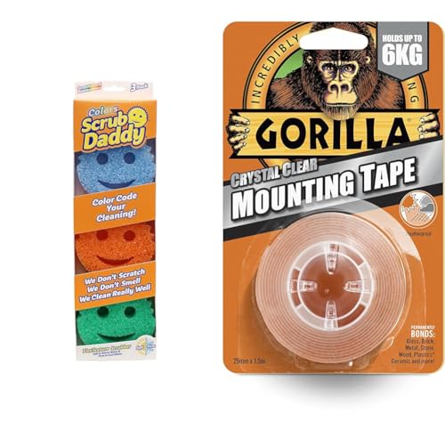 Scrub Daddy Colors, Sponge Scrubber Multipack, Dish Sponges for Washing Up & Gorilla Double Sided Mounting Tape Clear 1.5m, Pack of 1