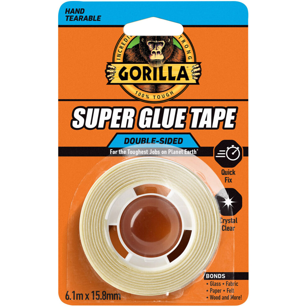 Gorilla Super Glue Tape, 6.1m x 15.88mm – Heavy Duty, Crystal Clear, No Mess Double Sided Tape, Ideal for Permanent Repairs, Quick Fixes & Craft | Bonds Glass, Fabric, Paper, Cardboard & More