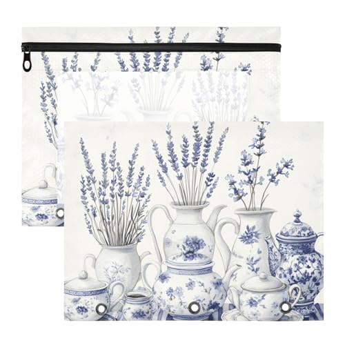 Quteprint 2-Pack Pencil Pouch for 3 Ring Binder, Lavender Flowers Kettle Binder Pencil Case A4 File Bag with Zipper Clear Window, Durable Binder Organizer Large Capacity for School Office Makeup