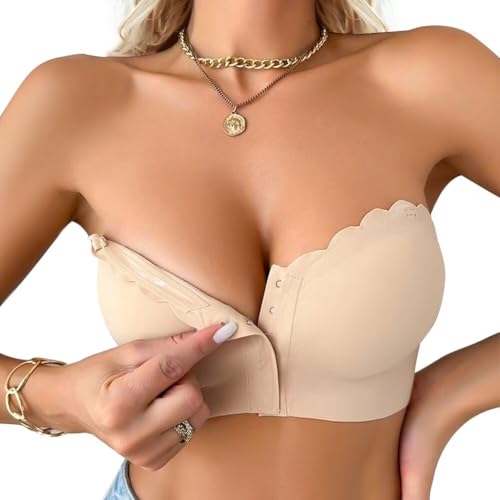 Sexy Code 1701 Women's Front Fastening Bra Strapless Bras for Women with Clear Strap Non-Slip Bandeau Seamless Non Padded Tube Top(D474SJ,Beige,XL)