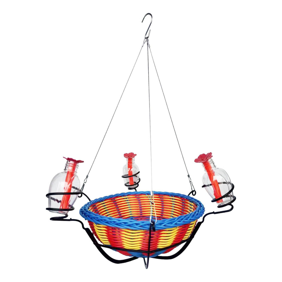 Multicolored Hummingbird Feeder Basket for Outdoors, 3 Clear Water Feeding Flower Bottles, Attractive Patio Bird Waterer