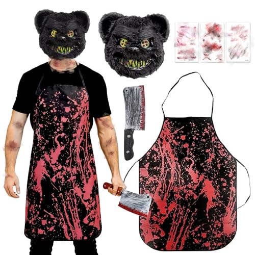 Halloween Costumes for Men, Halloween Apron Mens Butcher Costume Ideas Male Includes Fake Cleaver, Bloody Apron, 3 Realistic Tattoo Stickers & Terror Mask - Perfect Outfit for Adult & Teen Chef