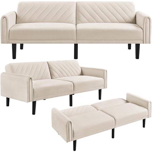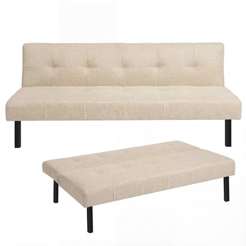 costoffs Click-clack Sofa Bed 3-Seater Multipurpose Sturdy Futon Modern Reclining Daybed with Large Side Pockets for Bedroom/Guest Rooms/Apartment Beige