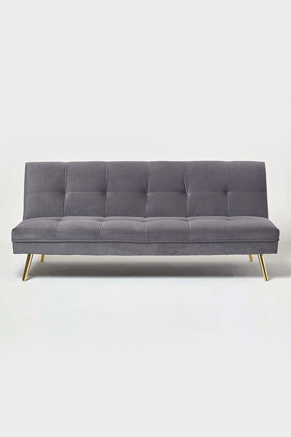 Bravich 'Victoria' 3 Triple Seater Velvet Fabric Sofa Bed-Grey. Click Clack Mechanism Sofa Bed With Gold Accent Legs. Living Room Furniture For Adult Guest Bed. Comfy Living Settee Couch Futon