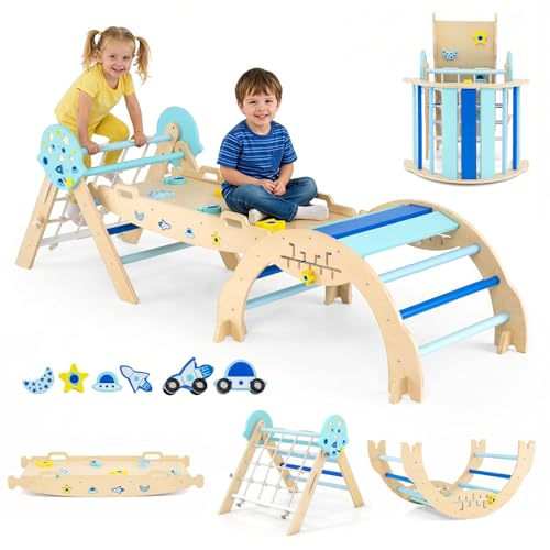 COSTWAY Toddler Climbing Frame, Kids Wooden Climber Toys Set with Arch, Reversible Ramp, Indoor Montessori Play Gym for Boys Girls 3 Years Old+ (7 in 1 Spaceman-Themed Arch Climber Ladder, Blue)