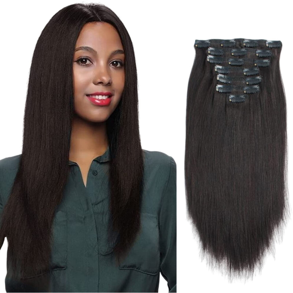 ABH AmazingBeauty Hair Real Remy Thick Yaki Straight Clip Ins Black Hair Extensions for African American Relaxed Hair 7 Pieces 120 Gram Per Set 14 In