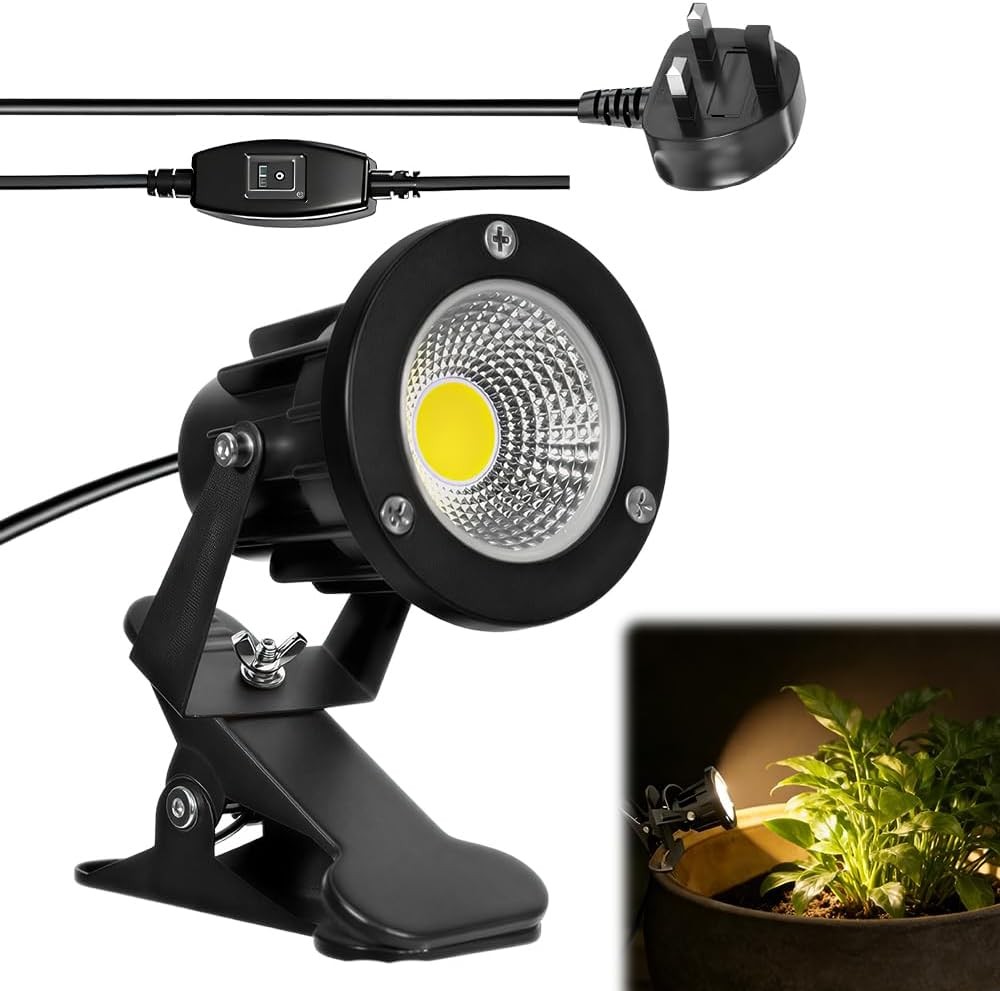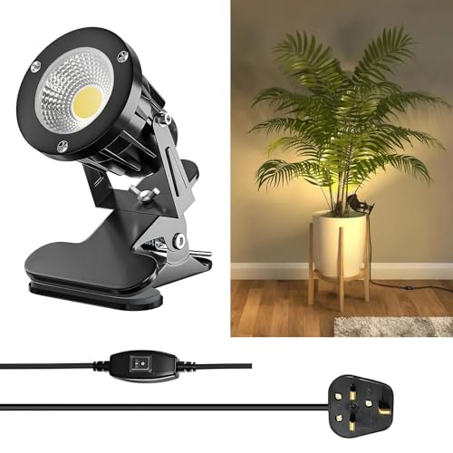 HomiShine LED Clip on Spot Light with On/Off Switch, IP65 Waterproof Plug in Spot Lights Plant Uplighters for Indoor Outdoor, 7W Clamp Lamp Garden Spotlight Mains Powered, 2M Cord, Warm White