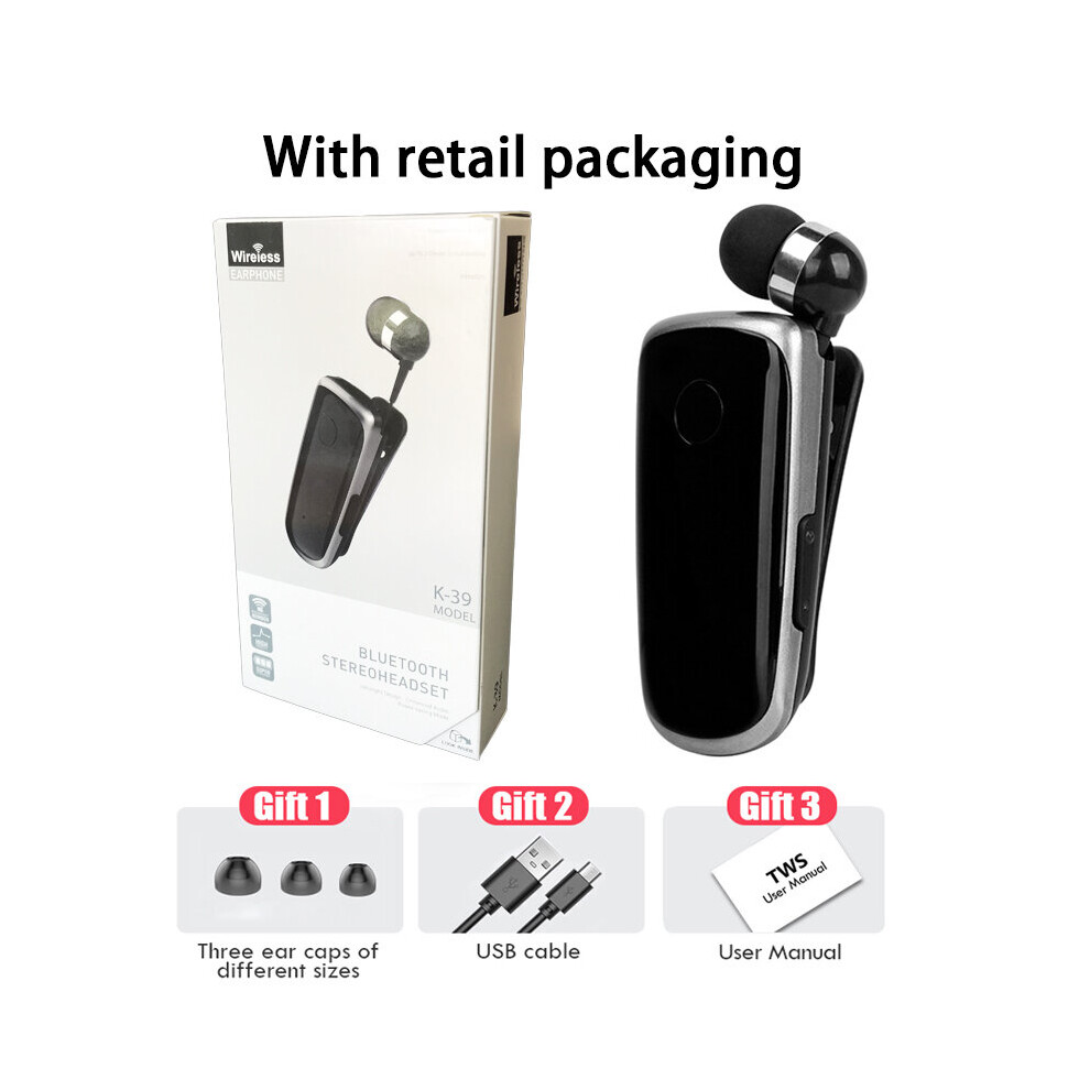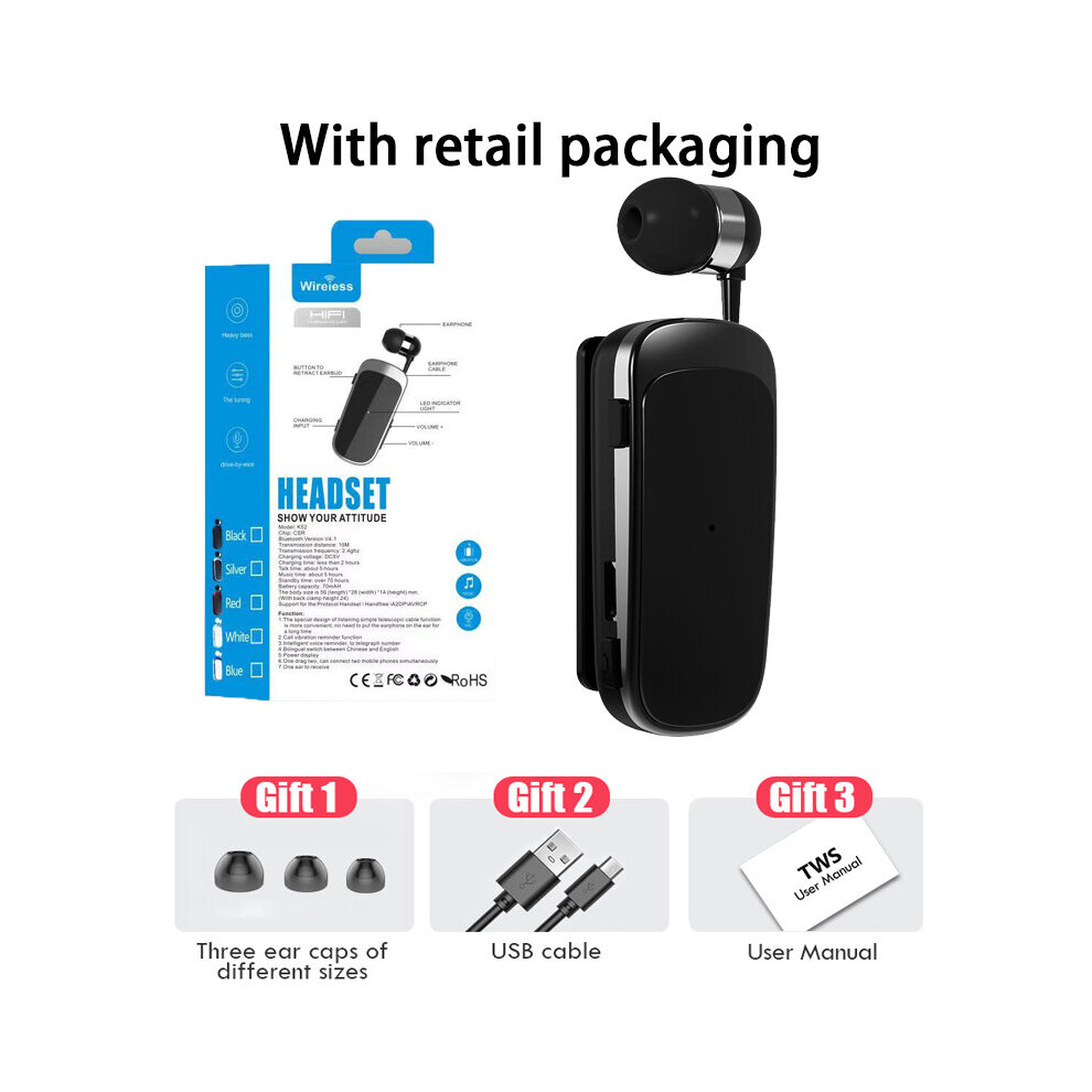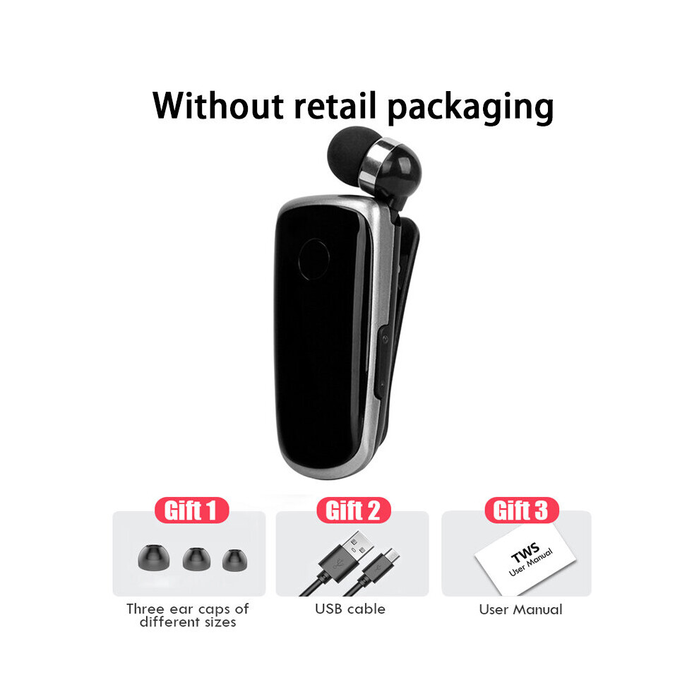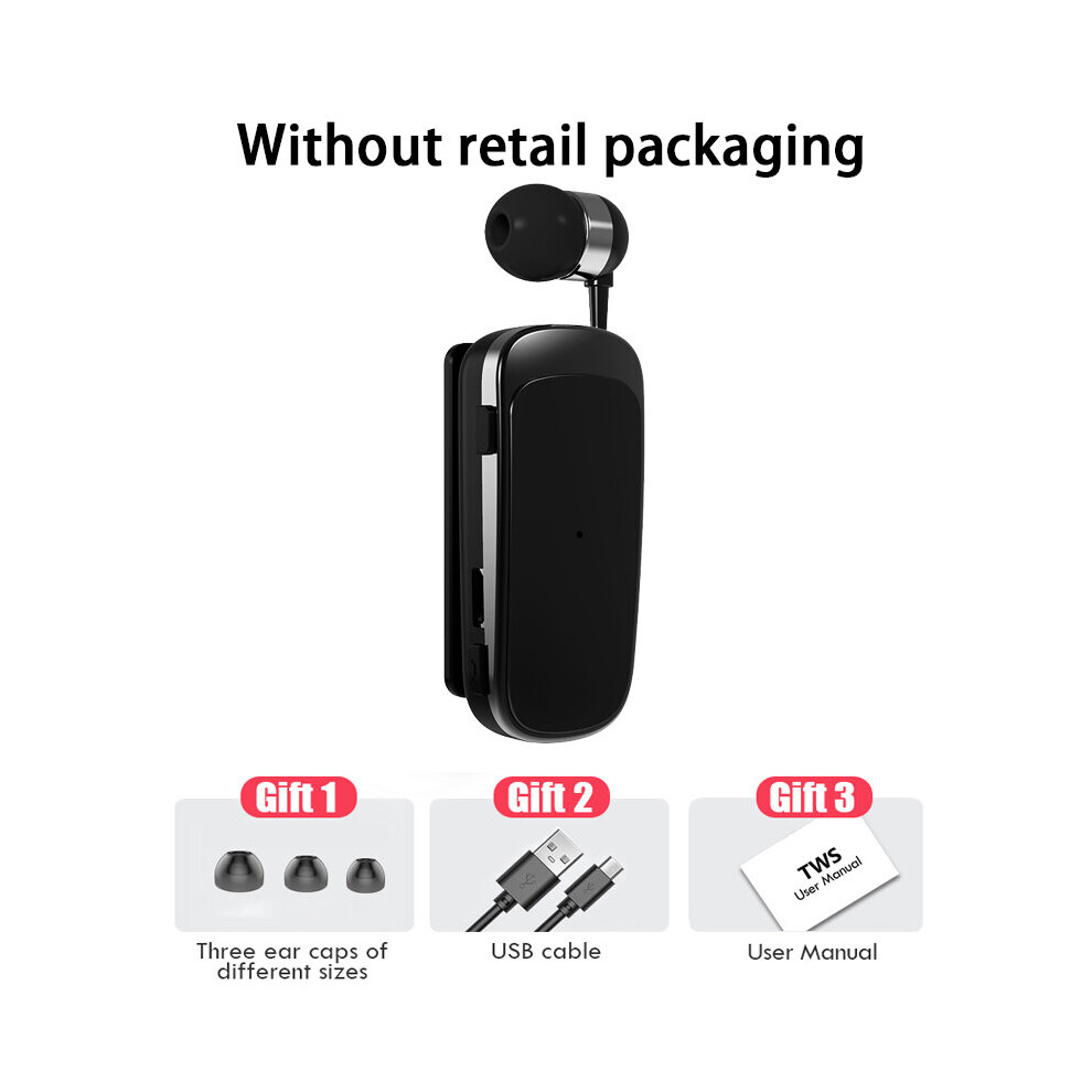 Wireless Bluetooth Headset With Microphone In-Ear Single Ear Hands-Free Earpiece Clip-On Lapel Earphones Black