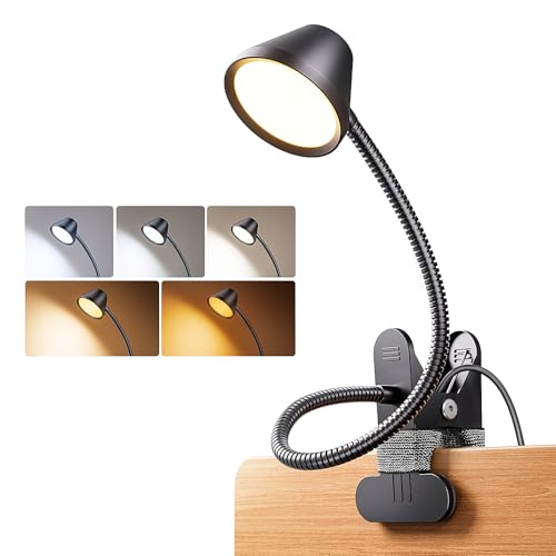 Woputne Desk Clip on Lamp for Reading Office, with 5V 2A Adapter, 10 Dimmable Brightness 3 Modes, Clamp Light for Bed Headboard, Bedside, Craft, (White)