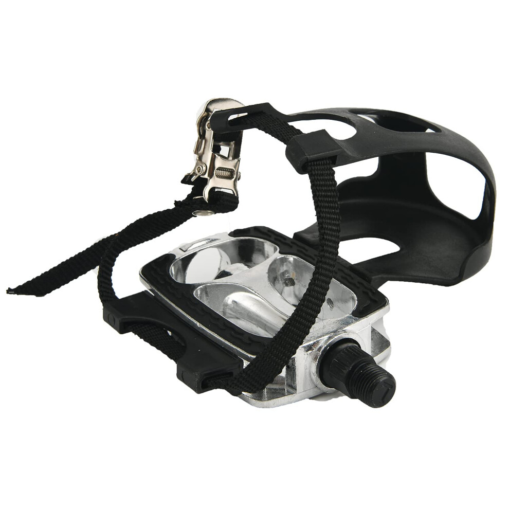 1 Pair Bicycle Pedals 1/2'' with Toe Clips Fixed Foot Strap Black Silver Tone