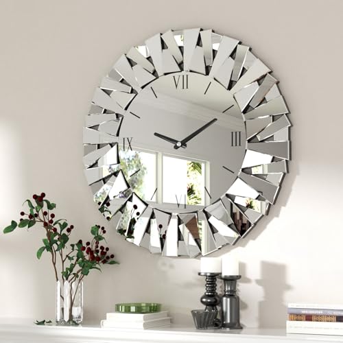 Round Wall Mirrored with Clock : Decor Mirror Wall Clock 80 x 80cm Round Beveled Glass Edge Wall Mirror with Clock for Modern Home Interiors, Bedroom, Living Room