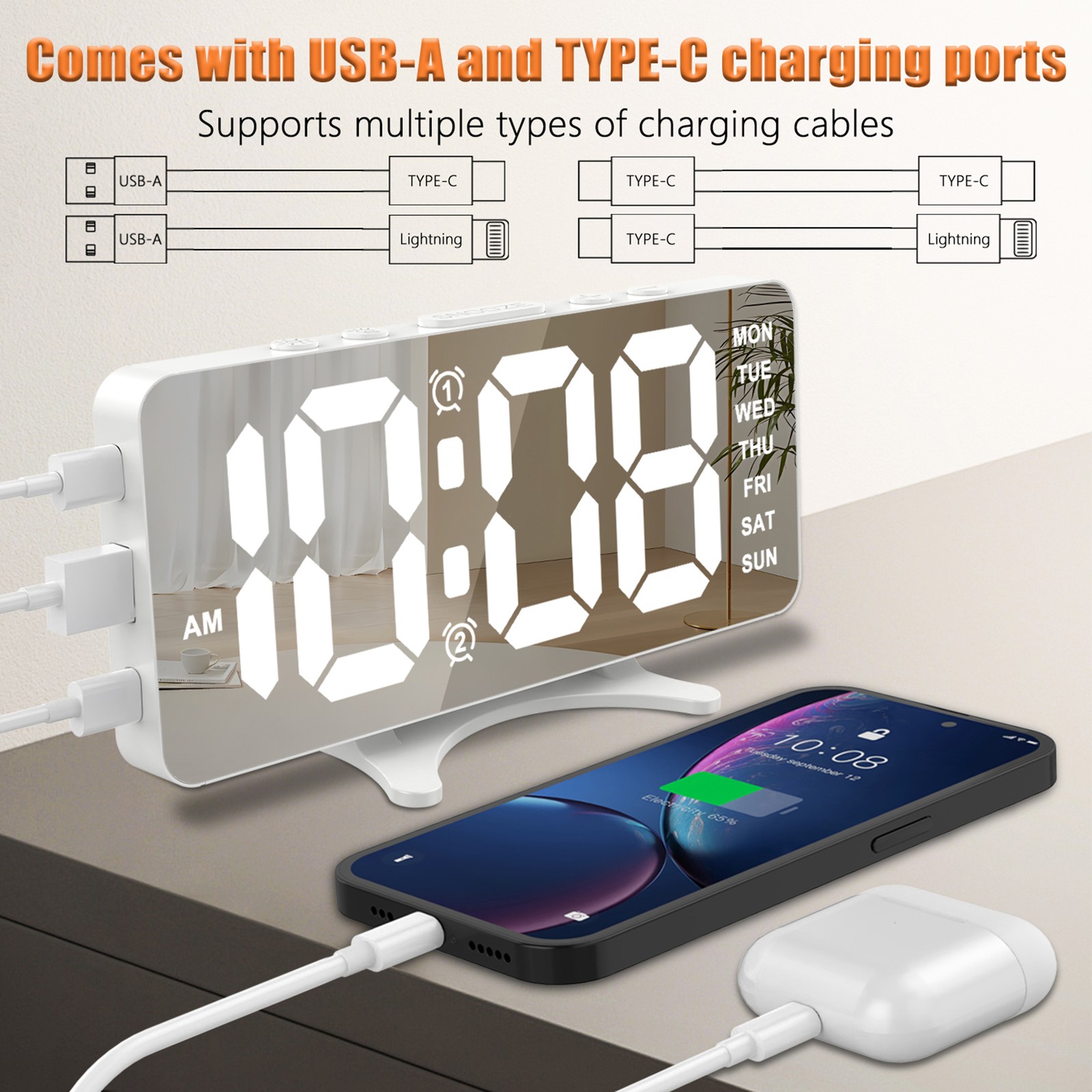 SHINROAD Adjustable Brightness Clock Mirror Surface Light Sensing Home Decor Dual USB for Living Room Bedroom Nightstand LED Digital Alarm Clock White Shell +White Light