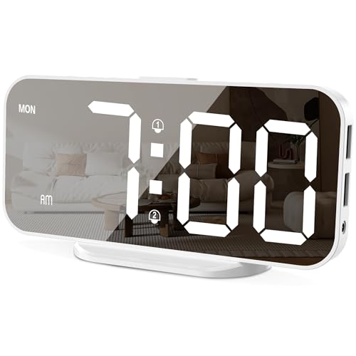 Digital Clock for Seniors Elderly, Mirror Alarm Clock with USB Charging Port, Adjustable Dimmer and Easy Operation, Silent Brightness Control for Kids