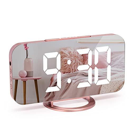 U-picks Alarm Clock with Dimmable LED Display, Digital Clock, Bedside Mirror Alarm, Snooze, 3 Dimmer Modes, Non Ticking 2 USB Charging Ports for Home Bedroom Decore-Rose Gold (EN8813)